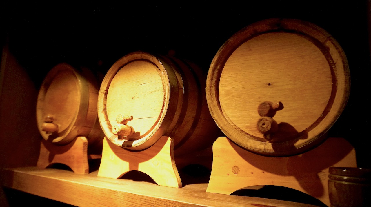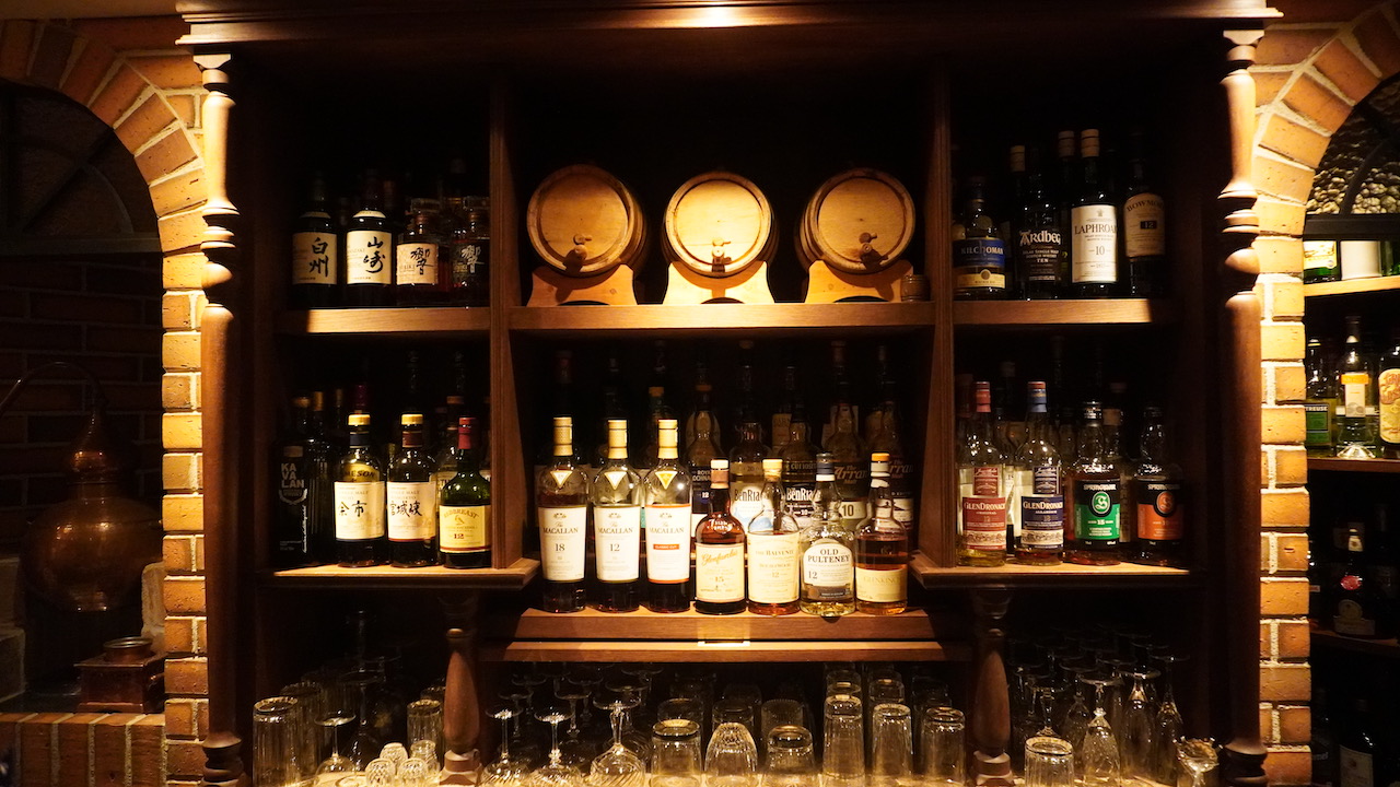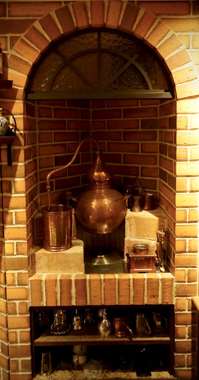 英国ビクトリア調の煉瓦造りのバックバー横に収まる銅製のポットスチル