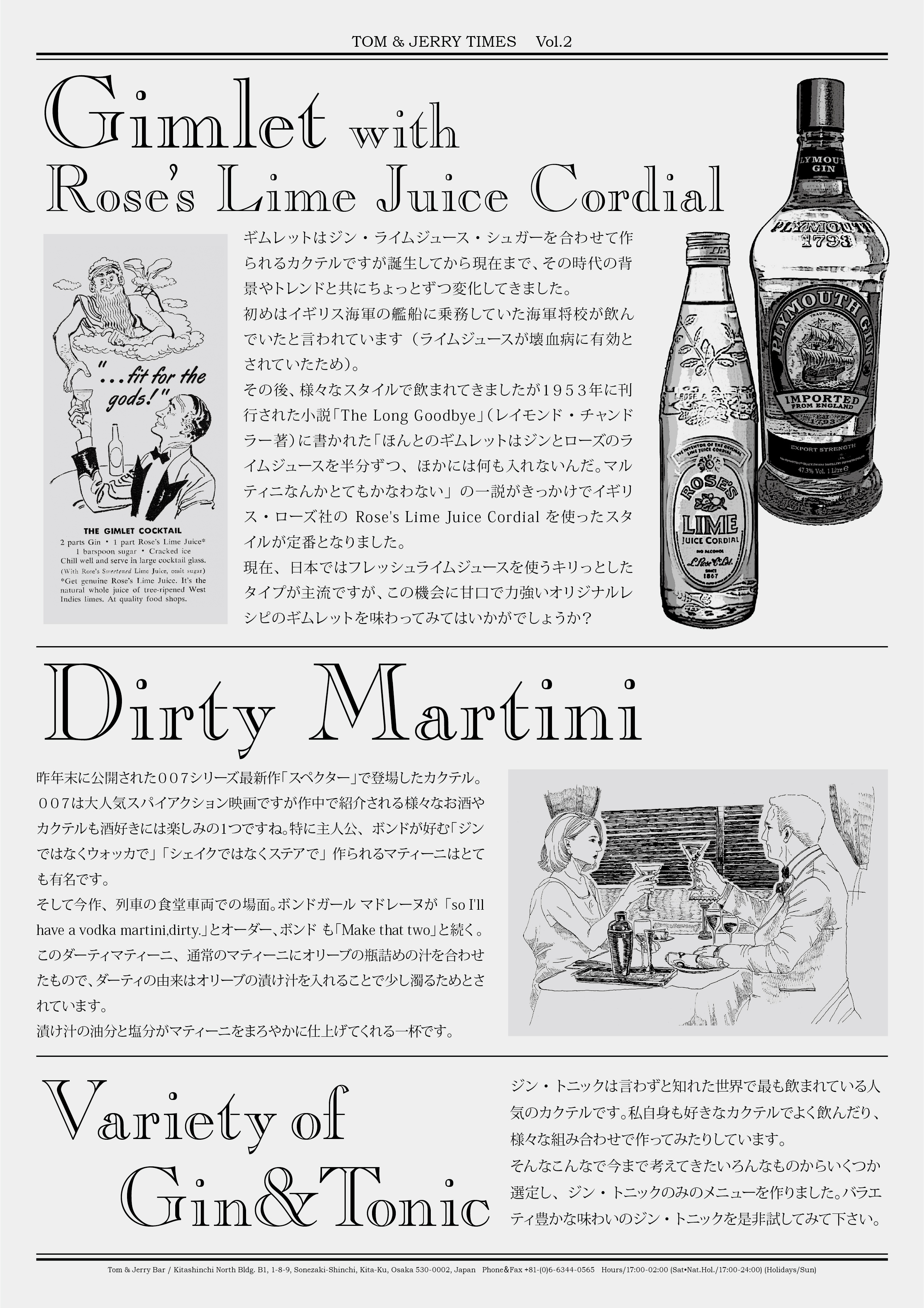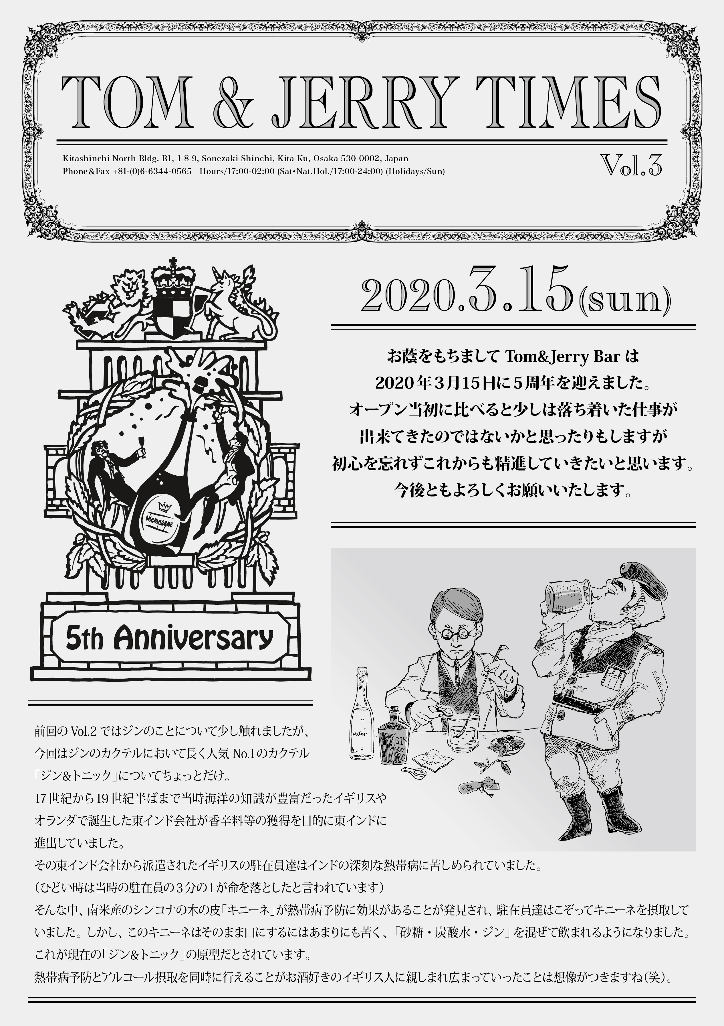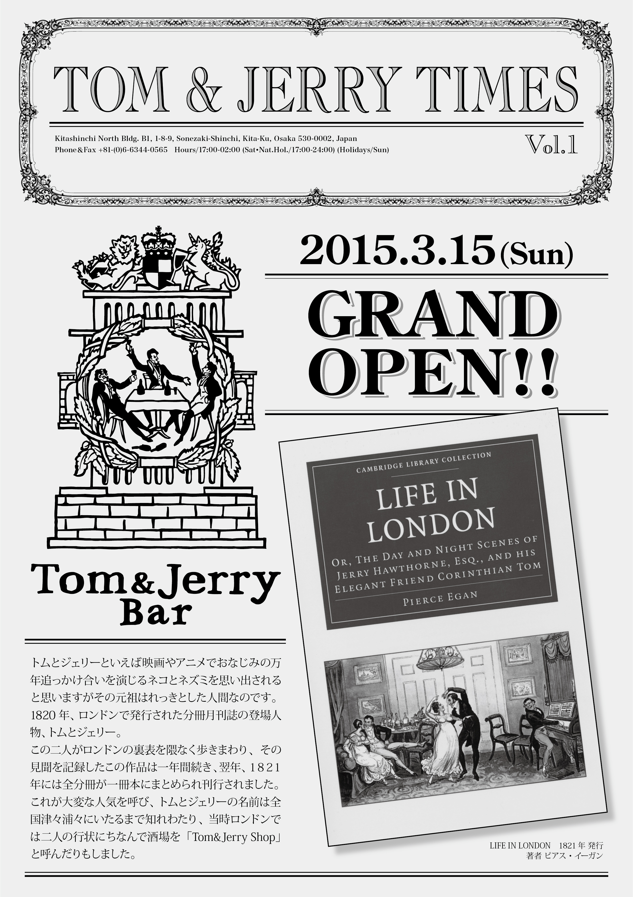 Tom&Jerry Barは、2015年3月15日、大阪・北新地の地にオープンさせていただきました。2002年、23歳の時に北新地の名門、BarKでバーテンダーとしての修行を始め、2009年からは英国ロンドンに渡り、映画でも有名なノッティングヒルにあるカクテルバーで研鑽を積みました。日本人の持つ細やかな技術やアプローチ、そして、日本人にはない独特なロンドンっ子を楽しませる英国流のカクテルへの発想。日英両国で肌で学んだ貴重な経験から感じた、双方の良い部分を掛け合わせたカクテルバーを目指しています。日本ではなかなか目にする機会の少ない英国の定番カクテルを多数ご用意しています。また、スタンダードカクテルもお好みに合わせてお作りいたしますし、ウイスキーもモルトを中心に各種取り揃えております。心地よい一夜をお過ごしいただけるよう最善を尽くし、皆様の御来店を心よりお待ち申し上げます。