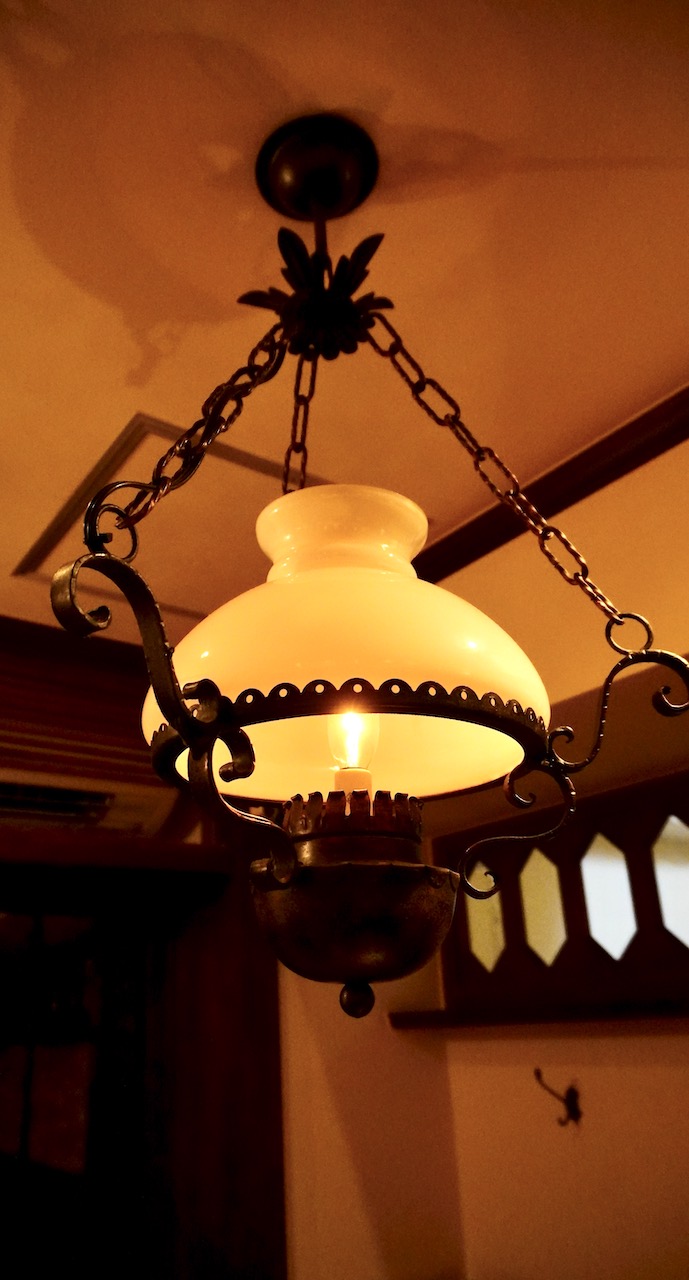 最大6人掛けのテーブル席を上から照らすアンティーク調のライト